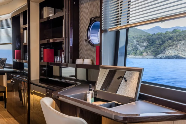 Natural light and beautiful views are a highlight to enjoy in every area of the boat: the boundaries between the boat and the sea are blurred by transparent panels in the cockpit area, as well as by the open railing, offering excellent visibility from the main deck. The visual experience becomes even more immersive thanks to large electric windows, to enjoy the view even when you are comfortably seated in the saloon, while also bringing some fresh air in.
