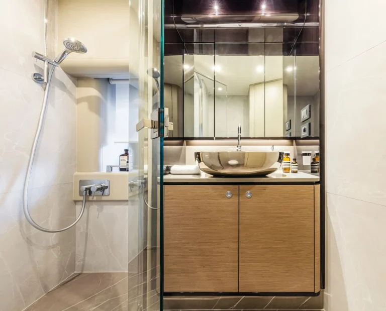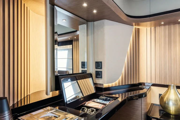 The lower deck includes two comfortable and elegant double cabins. The master cabin is placed midship while the VIP suite is located in the bow. Both cabins featured pillarless double-sided windows, spacious wardrobes, generous storage capacity, refined furniture with high-quality materials, desks, vanity areas, and en suite heads.