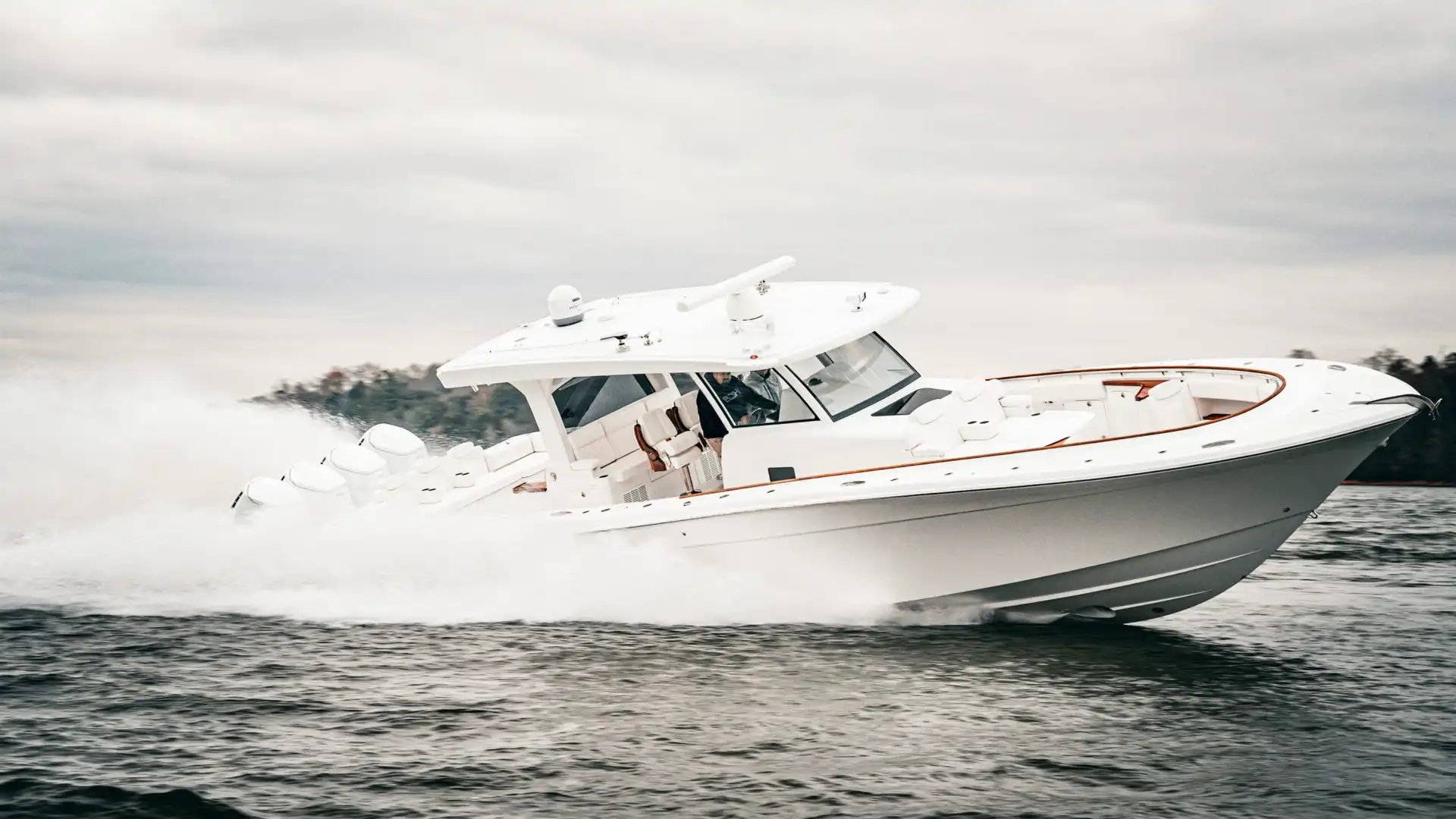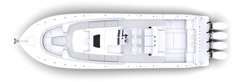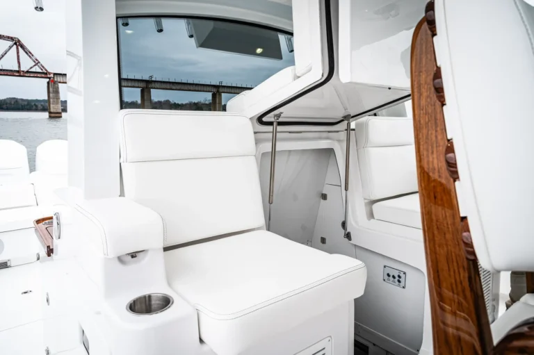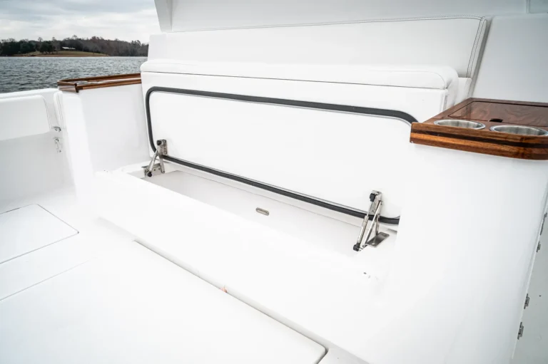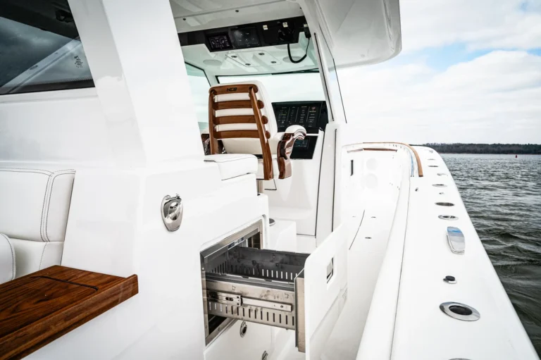 Exquisite place-making and attention to detail on deck leaves nothing to chance. A non-skid sole and padded coamings throughout are joined by well-placed steel grab-rails for safe and intuitive movement across a genuinely walk-around footprint. Fishermen on duty will enjoy an endless array of rod-holders in the teak-lined gunwale, along with elevated rocket-launchers, carbon-fiber Gemlux outrigger bases, a lift-gate to starboard as well as a transom gate out to a stern-side platform. In-deck and under-seat fish-boxes are joined by ice-boxes, two hefty sea-chests and a pair of plumbed transom livewells with a maximalist 55-gallon capacity and plexiglass viewing screens. There’s also a chunky bait-prep and tackle center in the