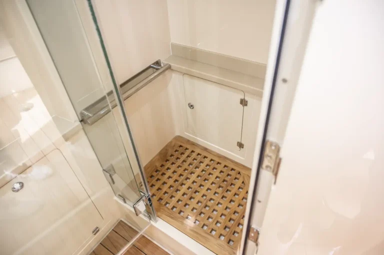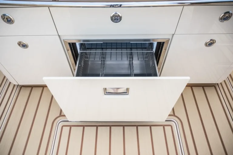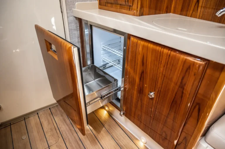 The bow area is dual purpose with seating to accommodate guests on the forward-facing lounger or around bow seats and table that convert to a large sun pad for lazy days catching rays; or remove the cushions for a fully functional fishing platform. The luxuriously functional cabin with queen sized berth, storage galore, galley kitchen, and separate head/shower compartment is the perfect place for air-conditioned comfort on hot days as well as longer trips with overnight stays.