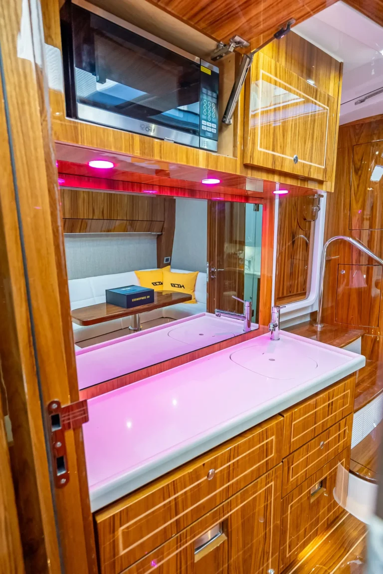 This vessel has all the comfort and styling of any sportfishing or cruising yacht in its class, but far surpasses them in versatile use and performance. There is an unimaginable amount of comfort and space aboard with a huge cockpit, a cabin that is twice as large as other center consoles, standard bow and stern thrusters, and large 1,730 gallon fuel capacity for long range. There is a comfortable European inspired bow seating area and deluxe front lounge for those wishing to sun worship. And aft is a customizable rear mezzanine seating area with a variety of feature configurations. Finally, for the mechanically inclined, there is a walk-in machine room where everything is within reach and out of the elements.