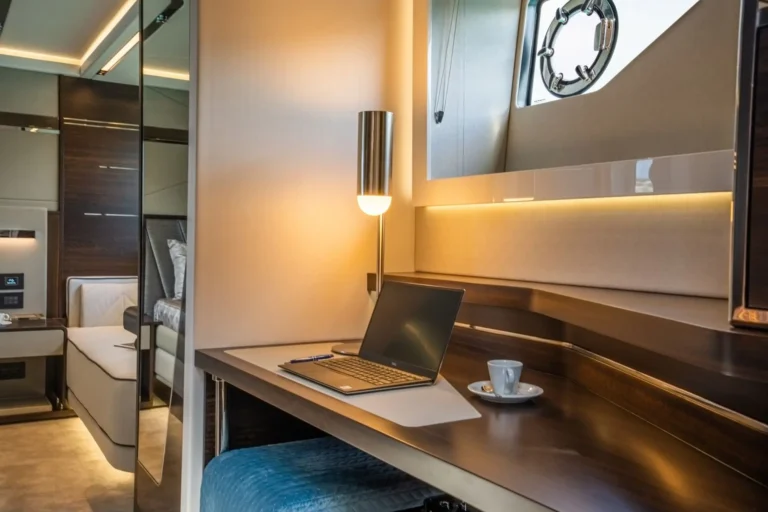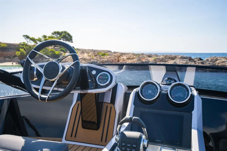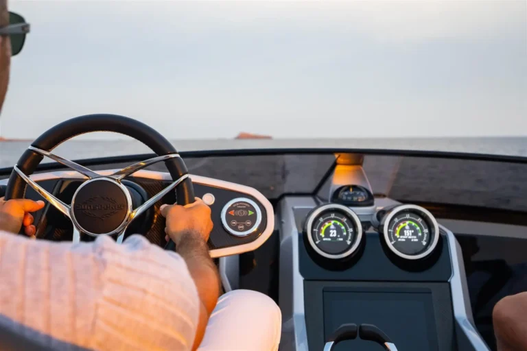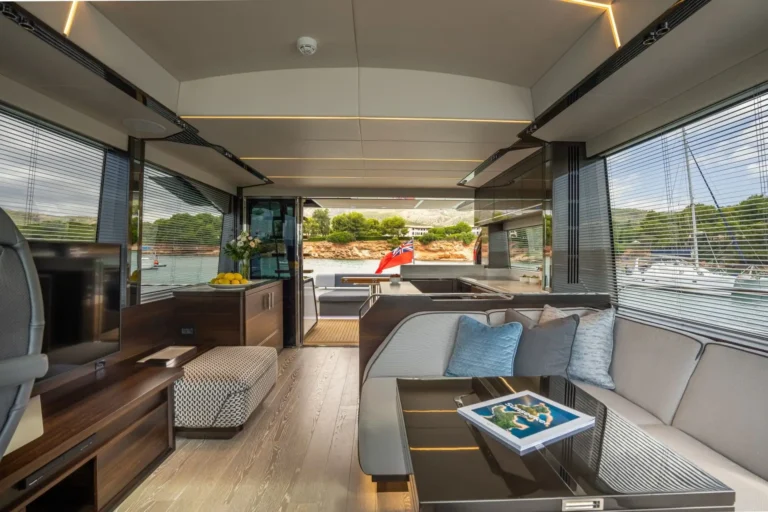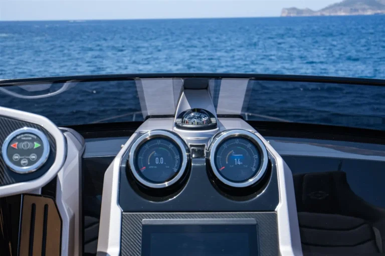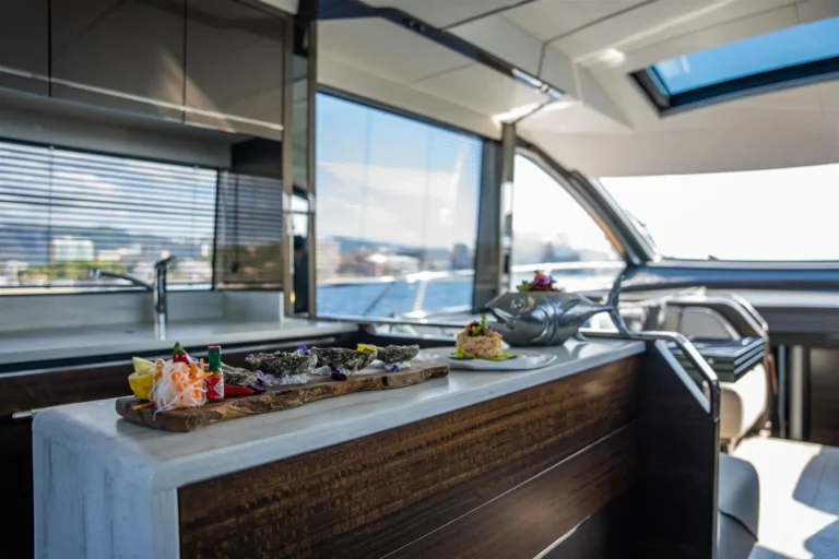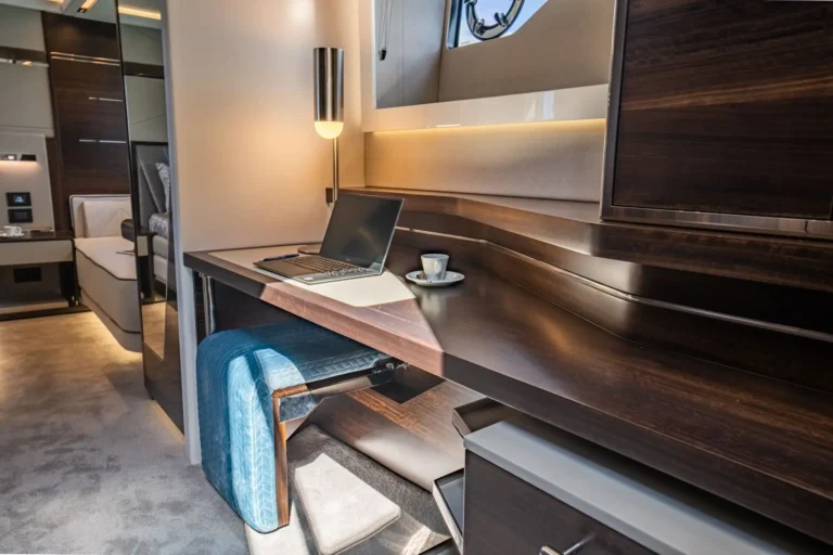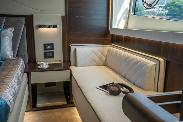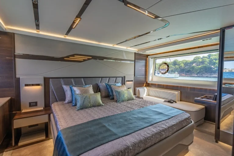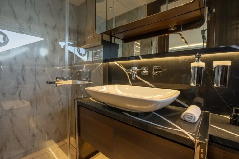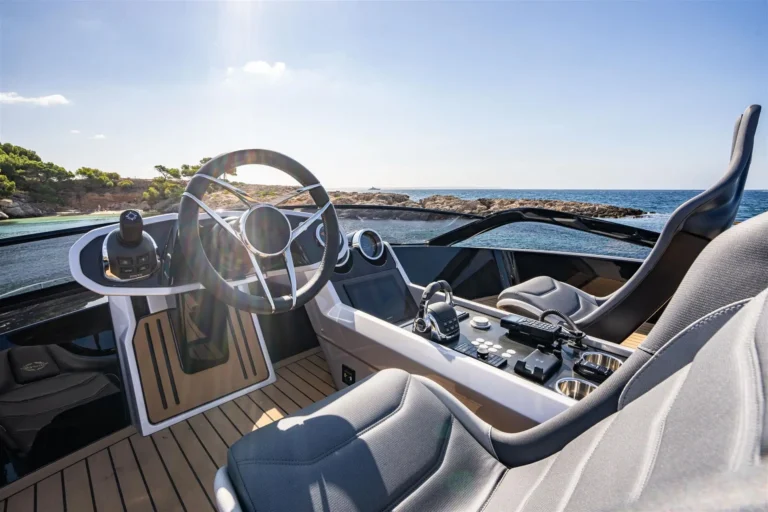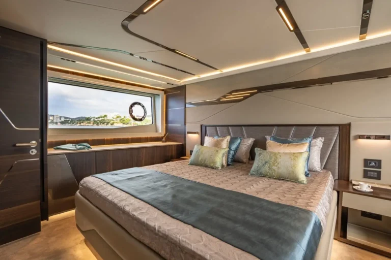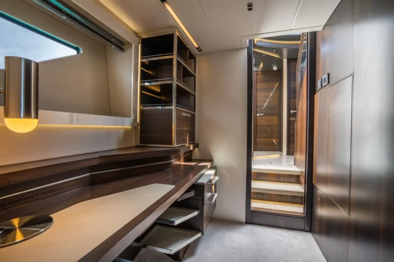The SkyHelm™, complete with IPS docking joystick, can be used in an upright position for low-speed manoeuvring or lowered to fall perfectly into outstretched arms when sat low in the bespoke helm seats cossetted by carbon fibre backrests and an integrated centre console. The modular layout allows for various specifications and enhancements, with space that adapts seamlessly to all kinds of socialising and adrenaline-seeking. Three cabins, including a full-beam master stateroom, can accommodate up to six guests in luxurious comfort, with a fully appointed crew cabin located forward of the garage.