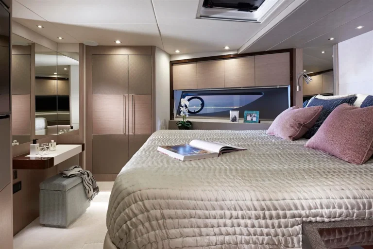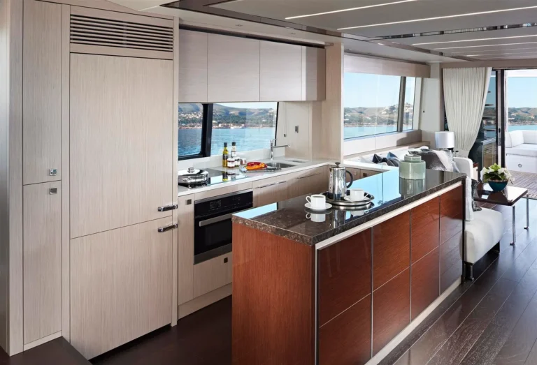 Not only does this model cut an impressive silhouette on the horizon, but an expanse of glass and sunlight also welcomes you onboard the 76 Yacht, and the main deck allows you to entertain with an almost 360-degree view of your surroundings. For ‘al fresco’ life, this flybridge yacht provides unprecedented levels of space and flexibility to suit owner needs. On the flybridge, choose a spa tub, jet-ski with crane or additional sunbeds to maximise this space. Complement the superyacht feel with any number of layouts.