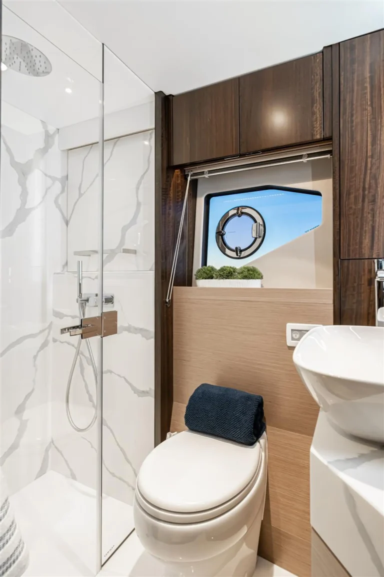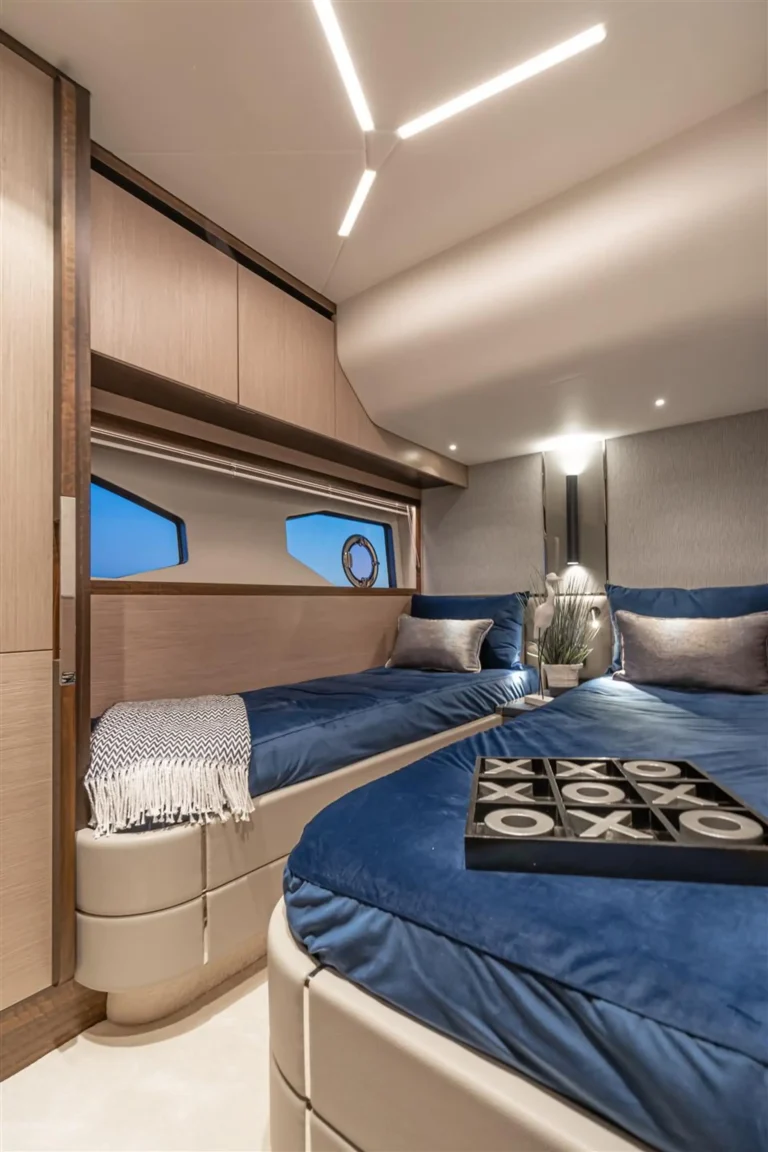 With an overnight capacity for up to six guests, with a separate crew quarters hidden beyond a transom door, this is a watercraft that can accommodate the entire family. Rooms on this level feature generous dimensions, on-trend wood paneling with a minimalist, clean finish, widescreen hull windows, upholstered wall panels and sensuous mood lighting to bring a touch of warmth to your evenings. A twin cabin and a VIP double by the bow share a marble-lined bathroom, while the full-beam owner’s stateroom features a sofa, a set of integrated cabinets, a king-sized bed and its own lavish en-suite.