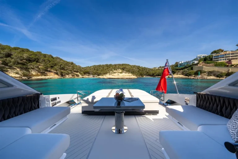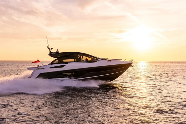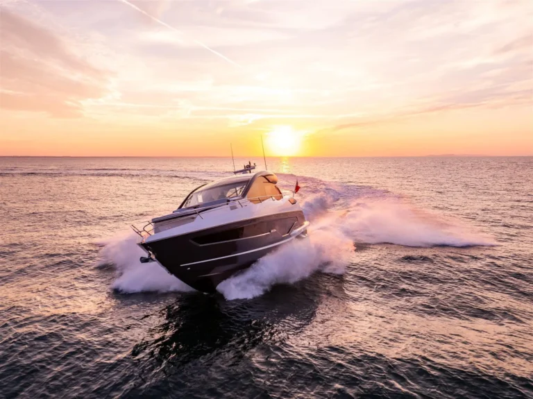 The Predator 55 joins Sunseeker’s iconic Predator range. Equipped with twin Volvo Penta IPS-950 engines, the 55 ft model reaches speeds of up to 36 knots.