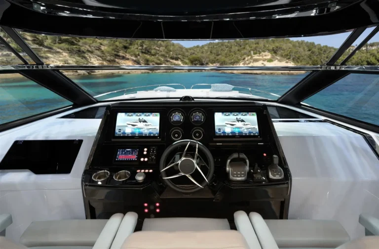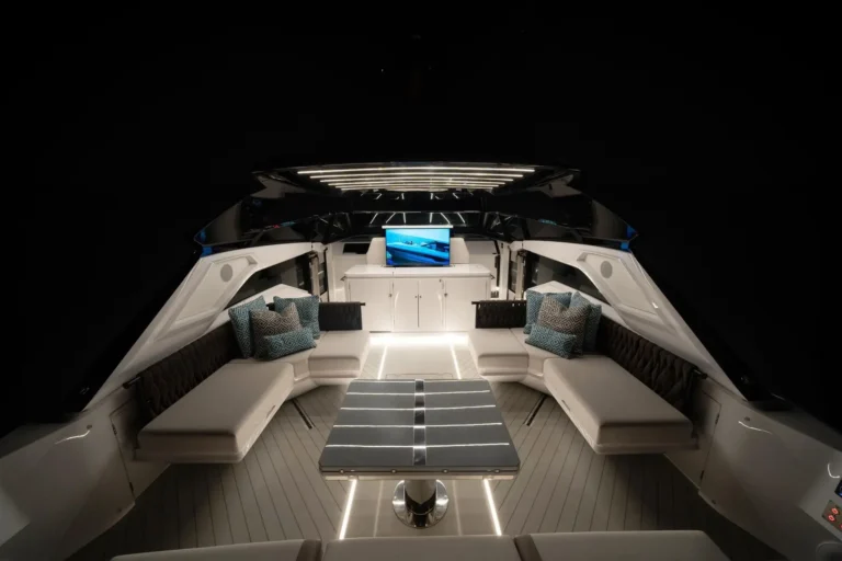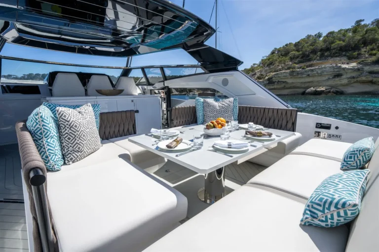 An eye-catching exterior is matched by equally lustrous interior appointments and features. The aft cockpit is designed with a central large wet bar and several furniture configurations to make the most of the spacious deck.