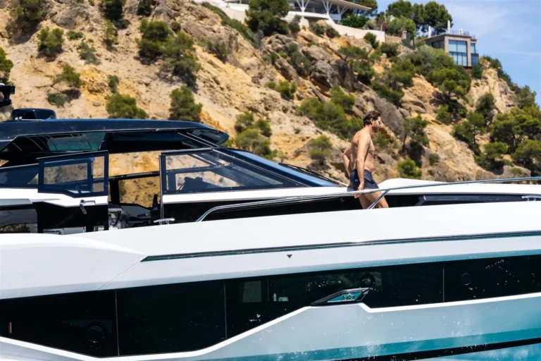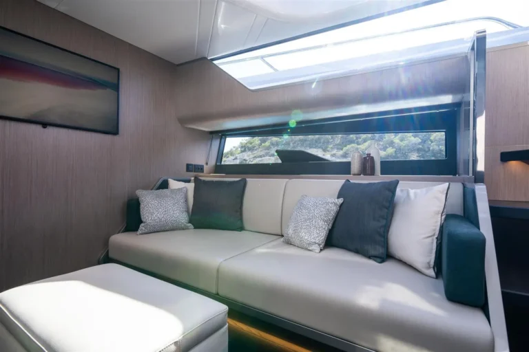 Steps lead down to a highly luxurious open plan lobby and galley area sat beneath LED lighting. Further recessed lighting, curved wood and lacquer finishes all contribute to the premium feel that truly delights those who step on board. The light floods through from the expansive screen above and electrically operated blinds allow intimacy and shade when needed. Forward is a VIP cabin with en-suite, upholstered side units and a wardrobe unit to port. There is a large bed and the interior comes with different styling palettes throughout to give a customised and personal feel to every owner. Aft is the Master cabin with sliding berths to generate either a double or two singles and generous en suite. Black lacquer panels frame this main cabin creating an ambiance that is pure indulgence.