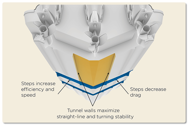 Another aspect of the unique hull design is the centerline ventilated tunnel. This feature extends from the second step aft to the transom of the boat. The tunnel has vertical walls that lock in the stern. With a strong grip on the water, the walls provide precise handling and control. This allows for maximization of straight-line and turning stability at both cruise and high speeds.