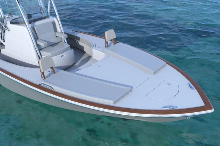 Like the current V-Series, the robust helm design will feature premium equipment such as dual 19” multi-functional displays (MFDs) or a single 24” MFD from Garmin and Simrad, a row of backlit labeled Bocatech switches and a fiberglass helm pod (teak and faux teak available). Additionally, a port glove box with 12V and USB outlet and specialty features such as paddle switches on the steering column for effective handling of the standard jack plate(s) and engine trim are standard.