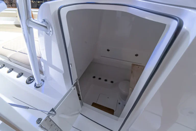 The V-41 will excel on the tournament circuit, with a clean deck layout that maximizes the boat’s 360-degree access and an arsenal of standard and optional fishing features to put you in the winner’s circle. The transom holds a 90-gallon live well. The decks are filled with insulated fish boxes, and rod holders can be installed virtually anywhere. Live-bait anglers will love the V-41. A raised live well can be integrated into the forward lounge for quick access while fishing from the bow. You can also opt for an in-deck live well in the cockpit, and on-deck live well inlet and discharge fittings can be installed in the transom corners.