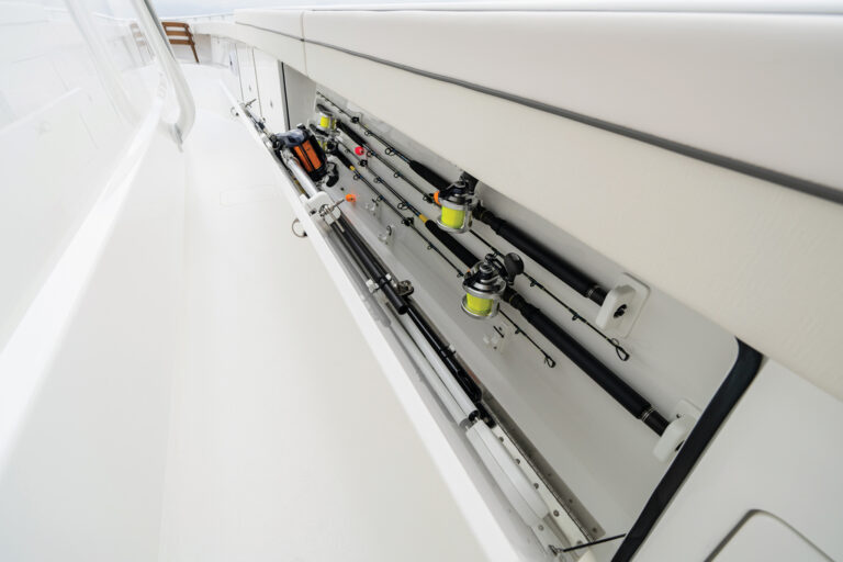 Alternatively, fish-focused owners may prefer the optional second row seating module with five Release Marine teak chairs and its additional tackle storage and cooler space. With each arrangement, the second row’s fiberglass seating module includes an aft-facing mezzanine seat with refrigeration underneath, a row of rod and cupholders, tackle storage, a drink box to port and a sink to starboard with the availability of an optional grill. Also available with the five-chair module is an optional 24-inch multi-function display, located on centerline that lifts up and faces the cockpit.