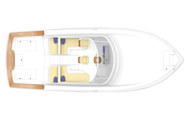 Measuring 109 square feet, the 38 Open Billfish comes ready for battle with a laminated mounting plate in the deck for a fighting chair or a rocket launcher (a cockpit table is also offered). Other fishability features include in-deck insulated fish boxes port and starboard, a walk-through transom door and lift gate, a bait freezer with upper tray, a transom fish box and live well, rod holders, tackle storage and fresh and raw-water wash downs. Two-person mezzanine-style seats flank the centerline walkthrough, and there’s refrigerated drink storage, as well as ample general storage throughout.