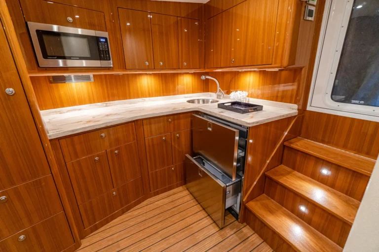 Like our legendary Viking convertibles, the 46 Billfish’s flybridge is designed with a tournament-style center console walk-around helm. The 46 Billfish has Palm Beach-style controls and power-assist hydraulic steering. Seating includes a single Release Marine teak chair (a second helm chair is optional) and lounges to port and starboard and a forward console seat. Our subsidiary Atlantic Marine Electronics can build and install a complete package of navigation and communication equipment to deliver the boat turnkey ready.