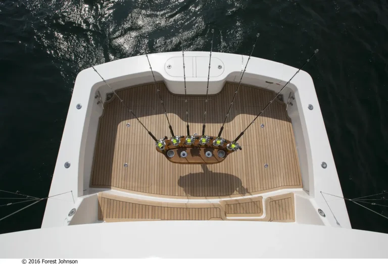 The lush interior is rich in detail with our signature hand-finished teak or walnut joinery depending upon the owner’s selection. Taking advantage of the spacious beam, the salon abounds with stylish appointments throughout the salon with an L-shape lounge and cocktail table, as well as an inviting dinette, which anchor the area for relaxing and entertaining. To starboard the peninsula galley has a raised bar top and is accented with Cambria treatments, under counter refrigeration, a microwave/convection oven and ample stowage behind the maple-lined cabinetry. Overnight accommodations are plush with three staterooms and two heads providing all the comfort and privacy you need for fishing and cruising in style. A laundry center and central vacuum system add sophisticated convenience.