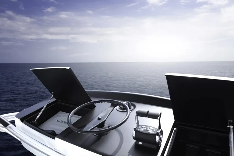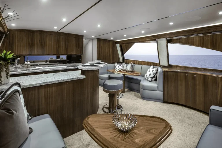A comfortable place to take in the action without interfering with the anglers, the observation mezzanine has Sunbrella covered cushions with an armrest that holds a pair of drink holders. The port-side seating has an underneath freezer with cooler space on the step below. The centerline seating provides access to the engineroom; there’s also a refrigerated drink box undermounted in the step leading to the salon. On the starboard side, you have a tackle cabinet with a push-release door and drawers, as well as an insulated storage box in the step below.