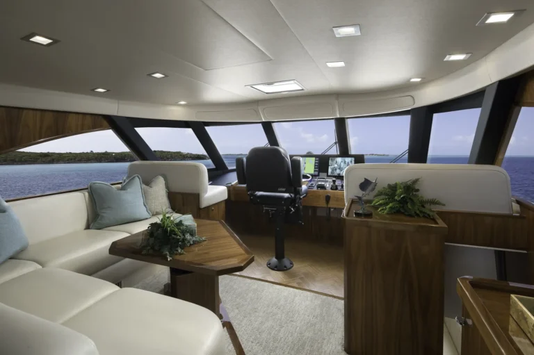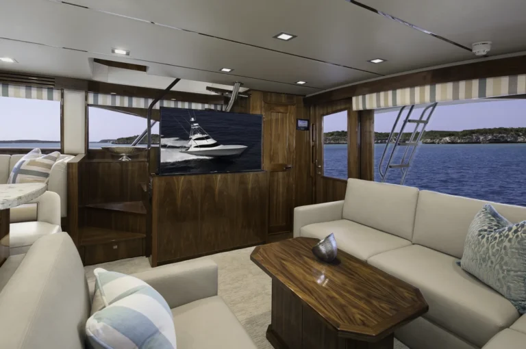 The standard Enclosed Bridge salon mirrors the Open Bridge plan with the addition of a circular staircase to the enclosed bridge helm, which serves as a second salon with an L-shape sofa, a cocktail table, refrigeration, and an entertainment center. An open galley, an L-shape sofa and crossover berths in the forward stateroom layout also are available. The day head is standard on both versions.