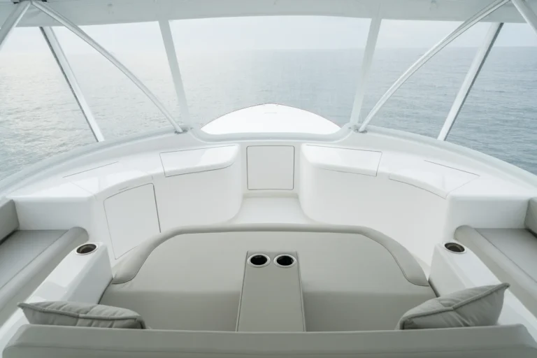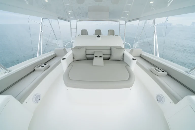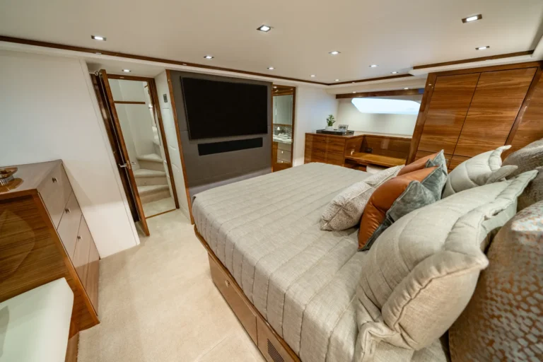 The interior of this amazing yacht features a horizontal-grain natural walnut throughout, available in satin or gloss finishes, and interior doors with horizontal and vertical grains and ebony inlays. Enter the salon from the mezzanine through a port-side electric sliding door. You’ll immediately notice the abundance of natural light pouring in through the shapely salon windows. To port, there’s a convenient day head, making trips below unnecessary during fishing excursions. The open-concept design features three distinct gathering areas with a straight walkway that extends from the salon door to the forepeak, accentuating the sense of depth and space.