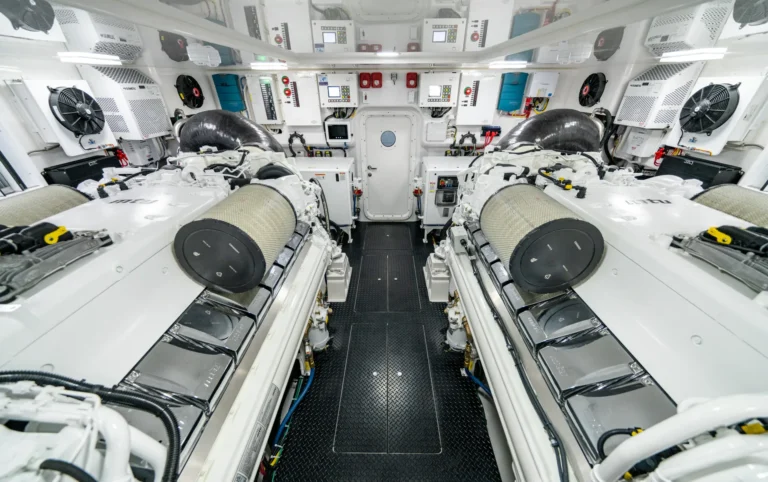 From an engineering standpoint, the Viking 82 is peerless. Painted in a gleaming Snow White Awlgrip, the engineroom provides excellent visibility and ease of maintenance. There’s plenty of space to access all sides of the 16-cylinder powerplants and numerous components and controls. The engines are mounted to the stringers that are reinforced with integrated aluminum for a strong, clean installation.